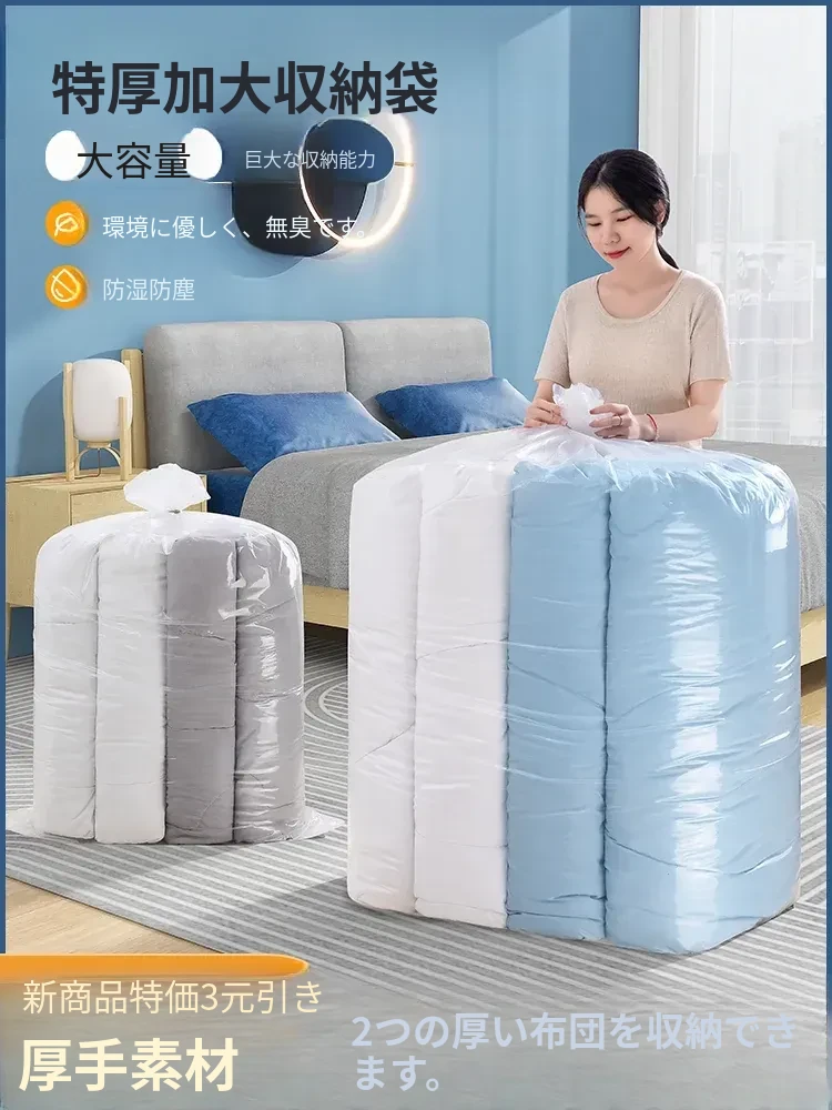 大容量防水防潮収納袋!布団やダウンジャケット、シルク布団専用の厚手デザインで、大切な衣類をしっかり守ります。整理整頓も簡単!これでお部屋スッキリ!