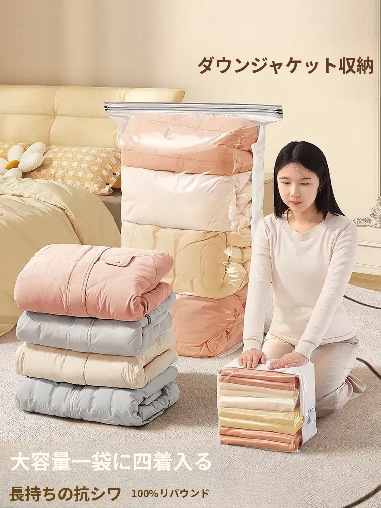 真空圧縮収納袋 - 衣類や布団、毛布をすっきり整理!厚手で耐久性抜群、ダウンジャケット専用の便利アイテムです。収納スペースを最大限に活用し、クローゼットをスッキリ整頓!