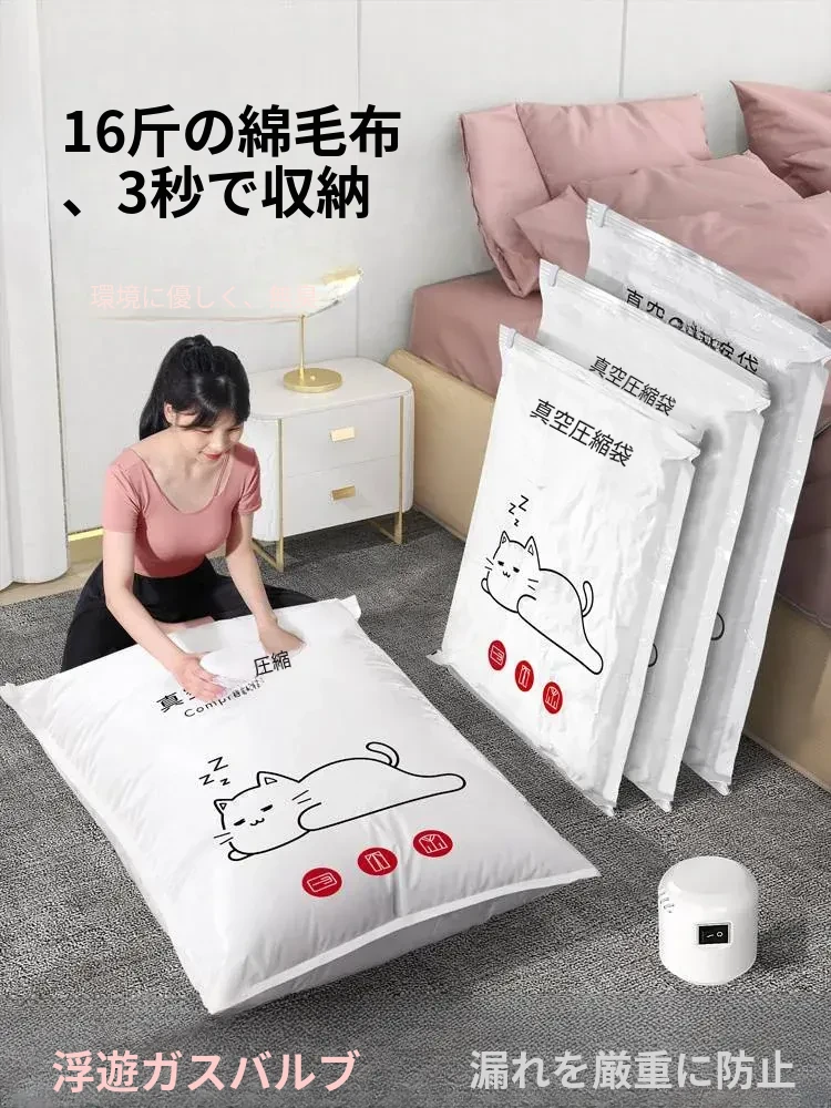 旅行や収納に最適!真空圧縮袋 - 布団や衣類を簡単に圧縮し、スペースを節約!家庭用電動ポンプ付きで、手軽に整理整頓が可能!お出かけや引越しの強い味方です。