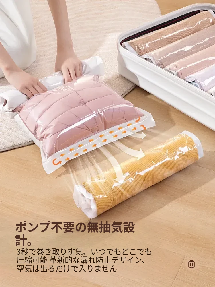 旅行用真空圧縮袋!手巻きタイプで簡単収納、衣類やダウンジャケットもスッキリ整理。空気を抜かずにコンパクトに!スーツケース専用の便利グッズで、持ち運びも楽々。旅行の必需品!