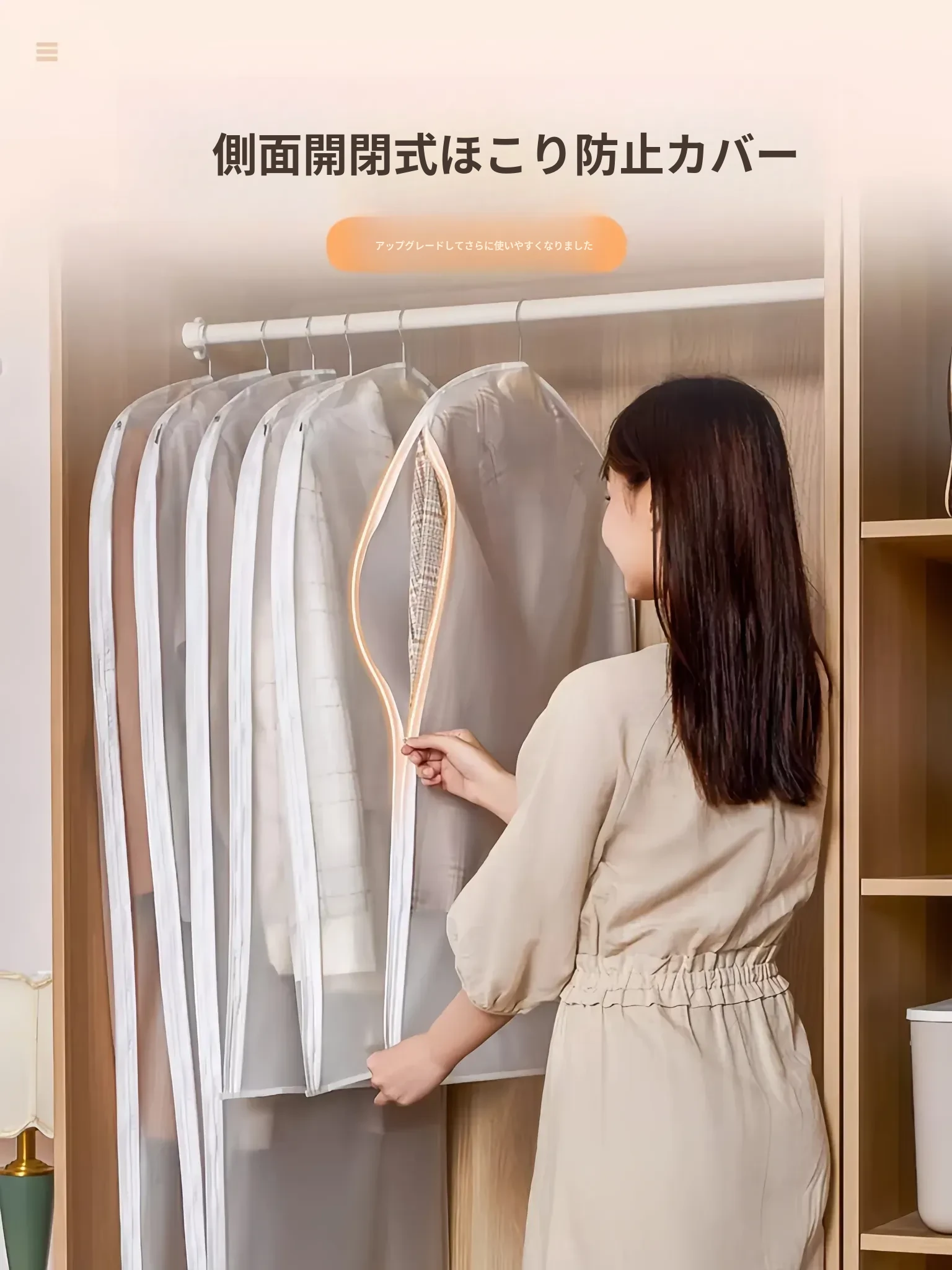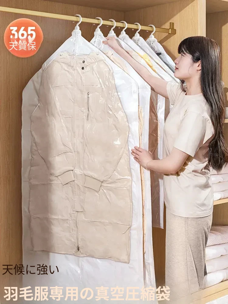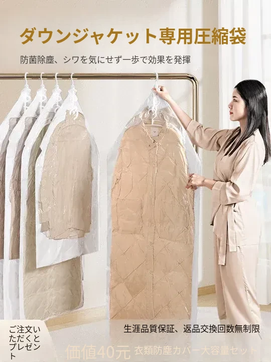 ダウンジャケット専用圧縮袋!衣類収納に最適なハンガー式防塵カバー。コートや厚手の服もすっきり整理!家の中をスッキリさせる便利アイテム!