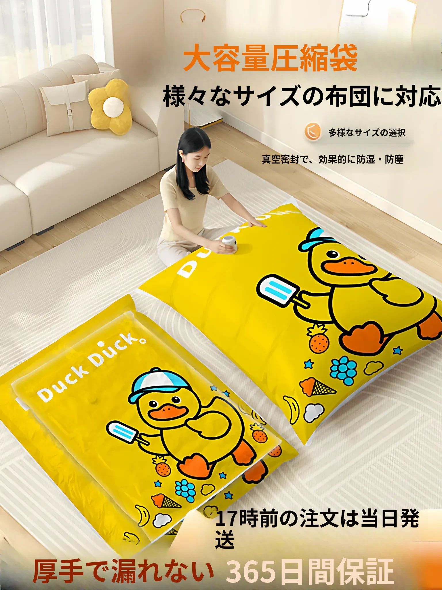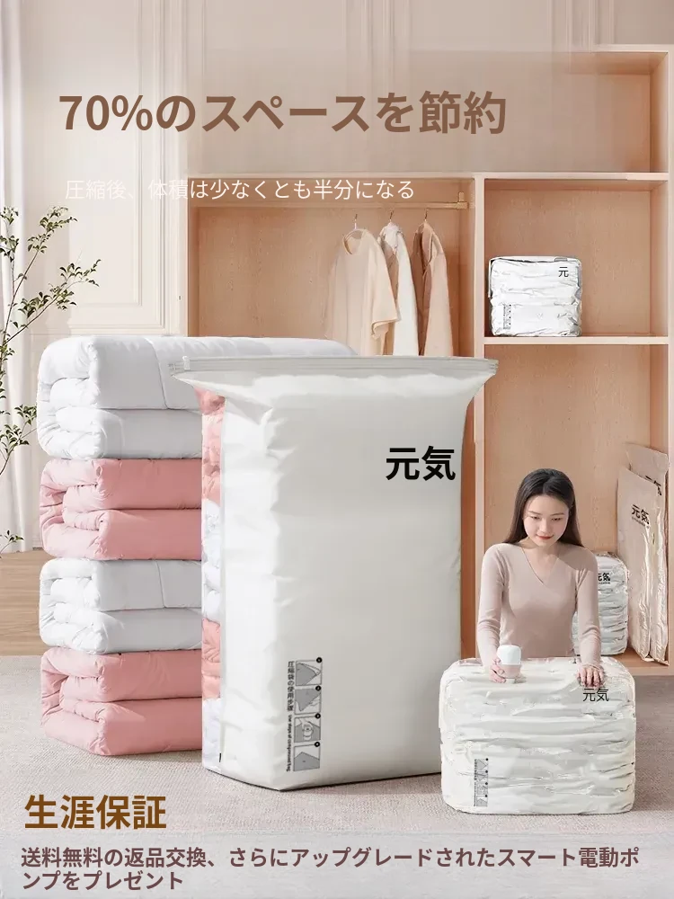 大容量真空圧縮袋 - 羽毛布団や衣類の収納に最適!衣類や布団をコンパクトに整理し、スペースを有効活用。家庭用にぴったりなアイテムで、衣替えや引っ越しにも便利です!