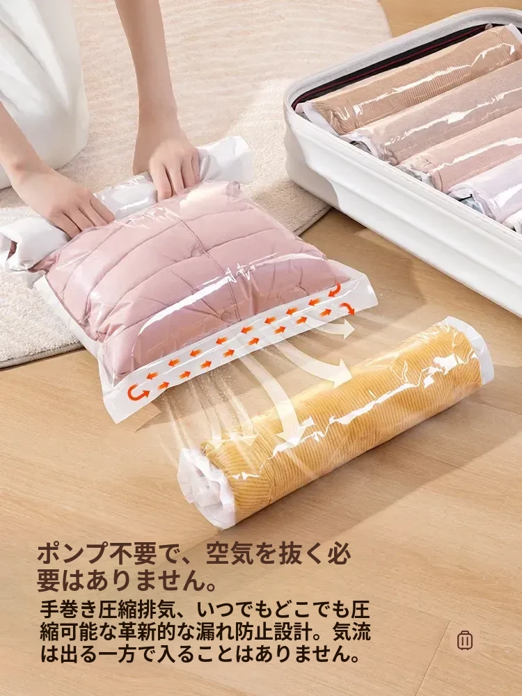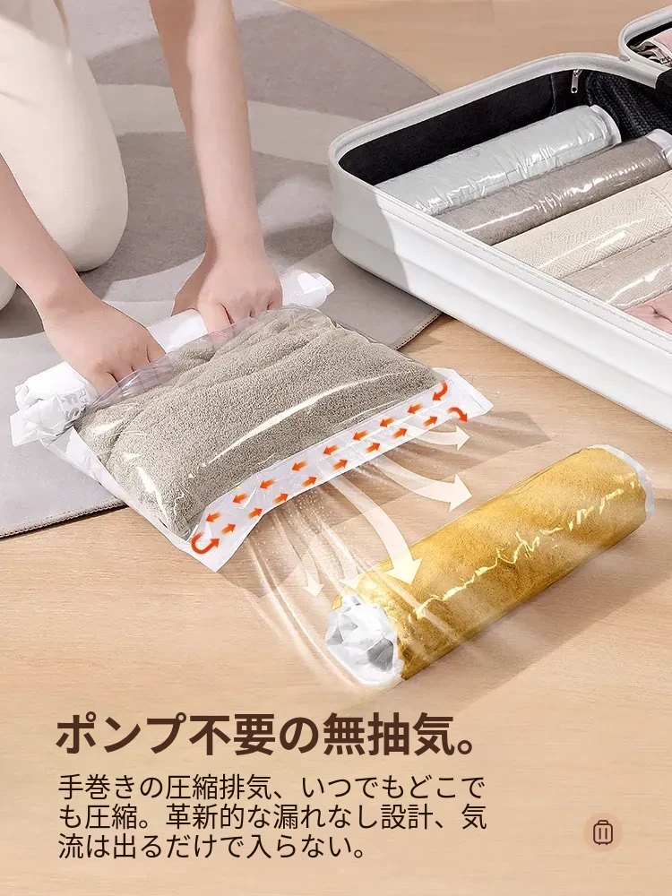 旅行に最適!真空圧縮袋でスーツケースのスペースを有効活用!衣類やダウンジャケットも簡単収納、空気抜き不要で手間いらず。旅行の必需品、あなたの荷物をスッキリ整理!