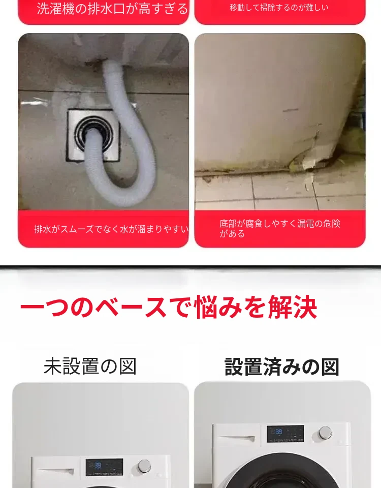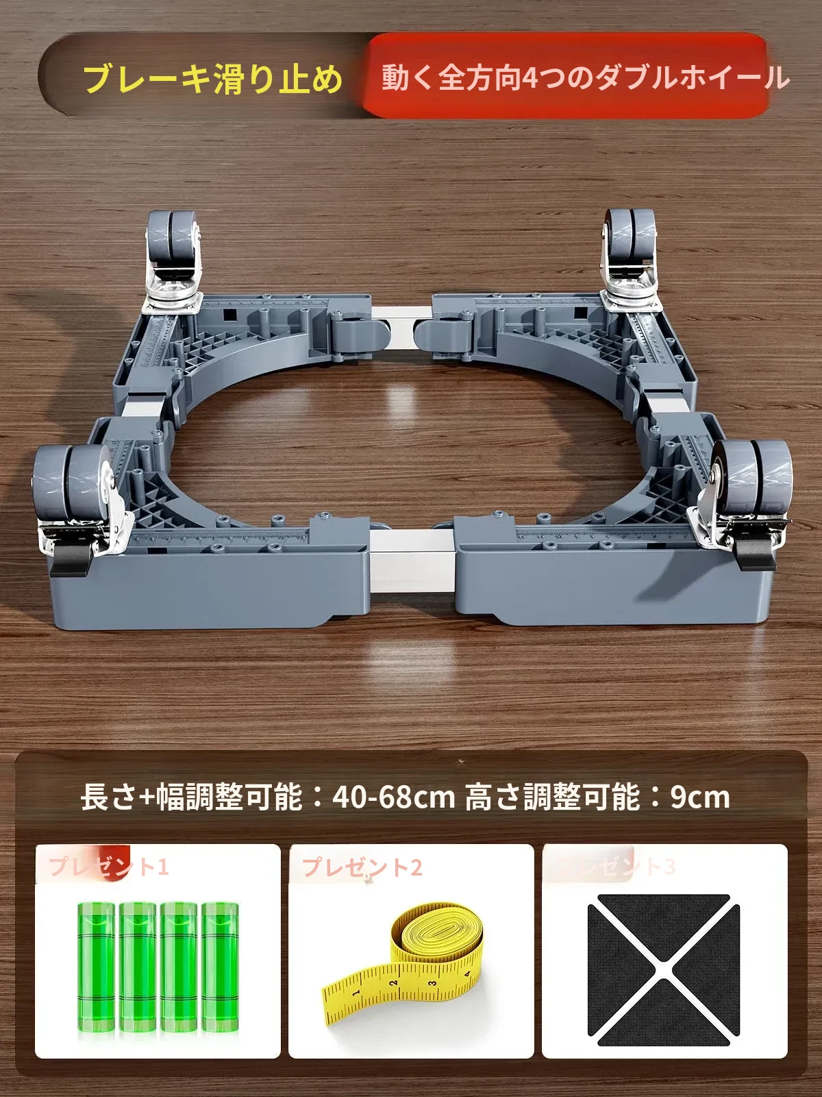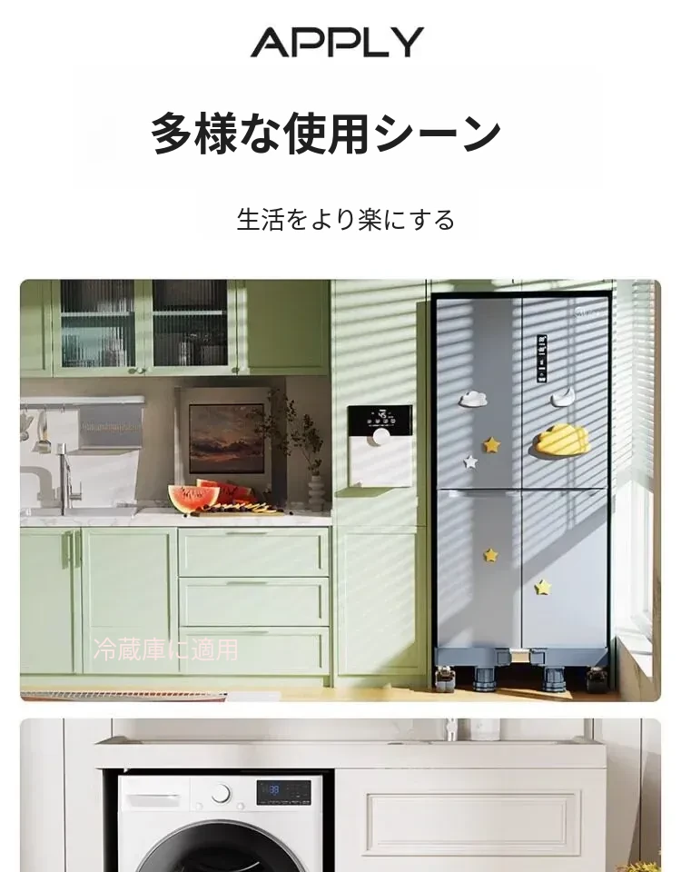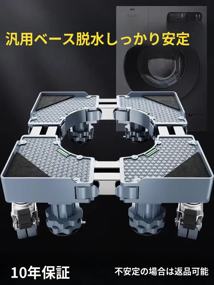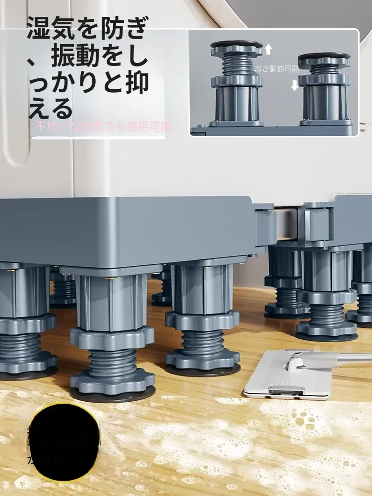 移動式のドラム式洗濯機用スタンド - 高さ調整可能な脚付き、冷蔵庫の収納にも最適!ハイアール製品専用の滑り止め・防震設計で安心!