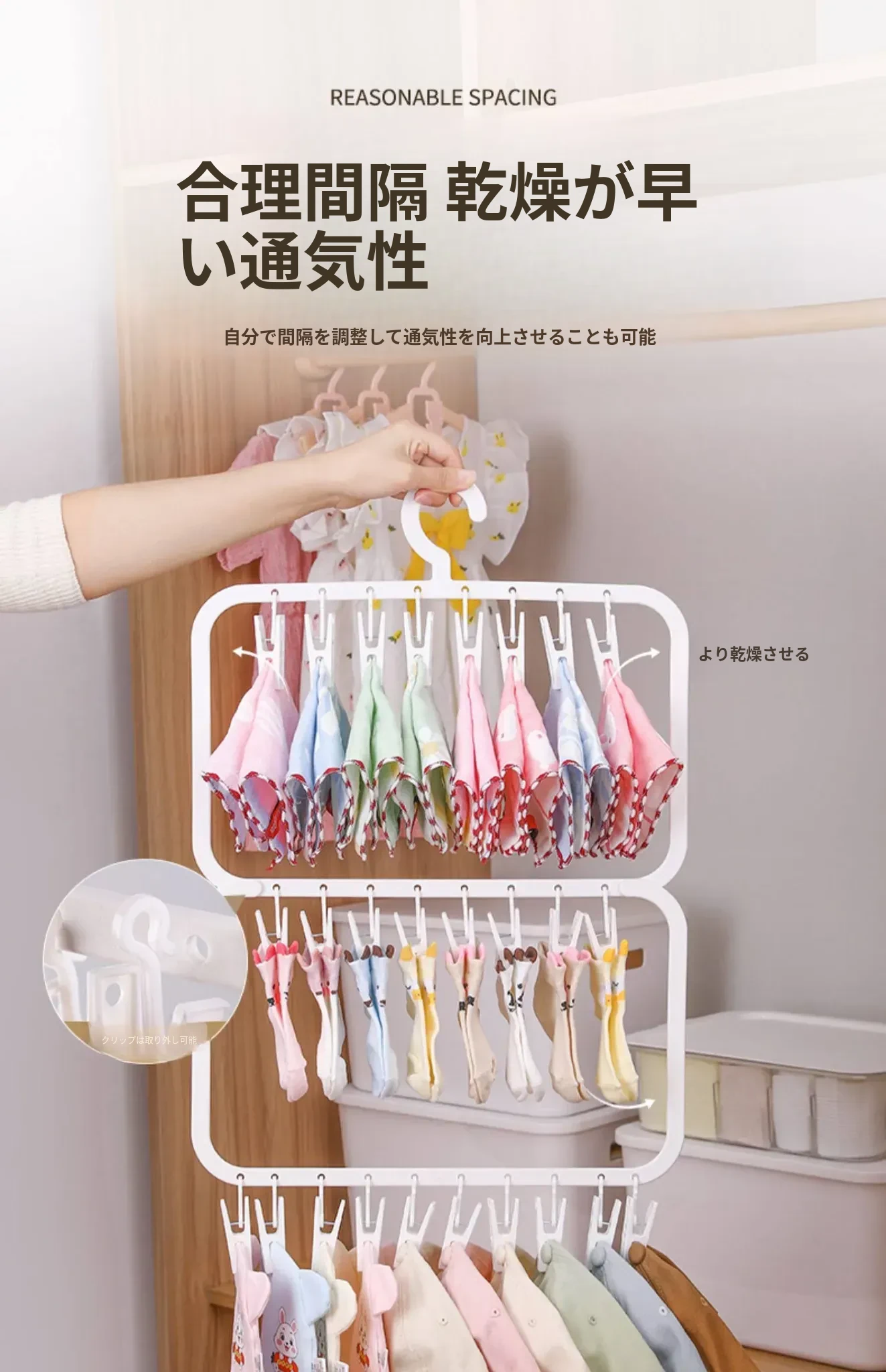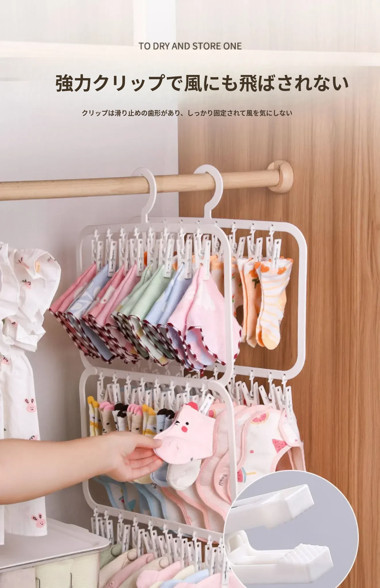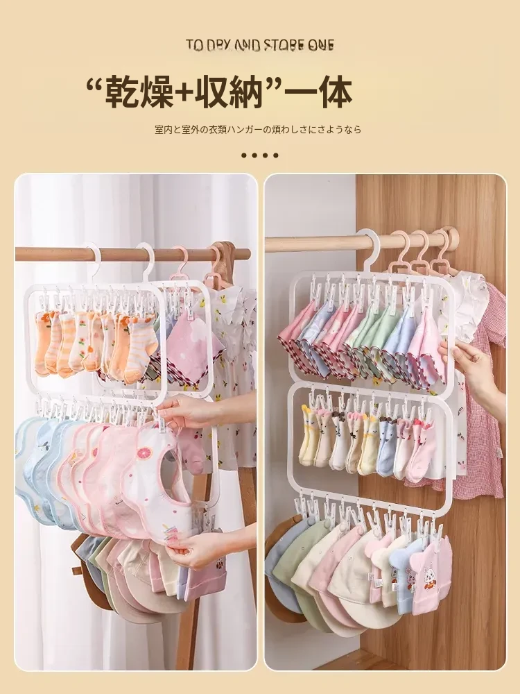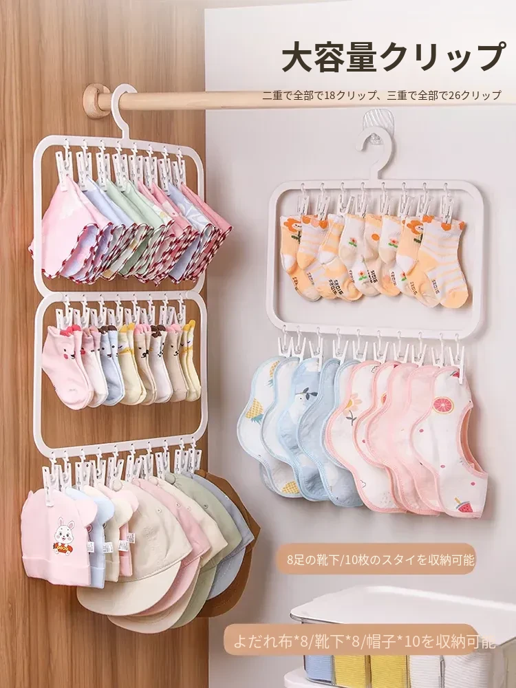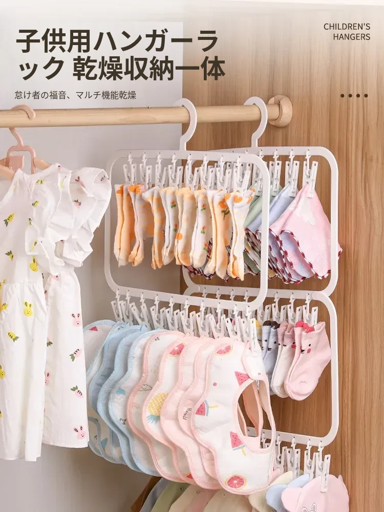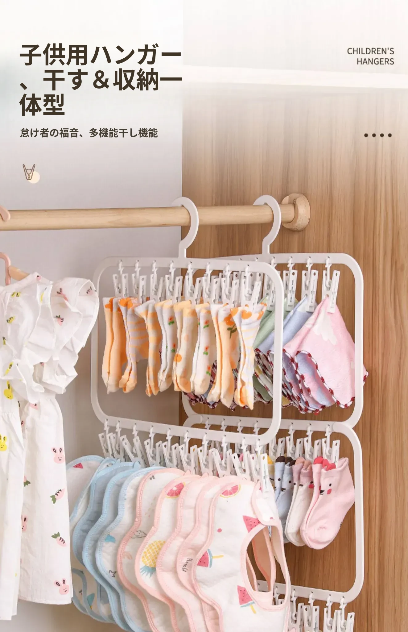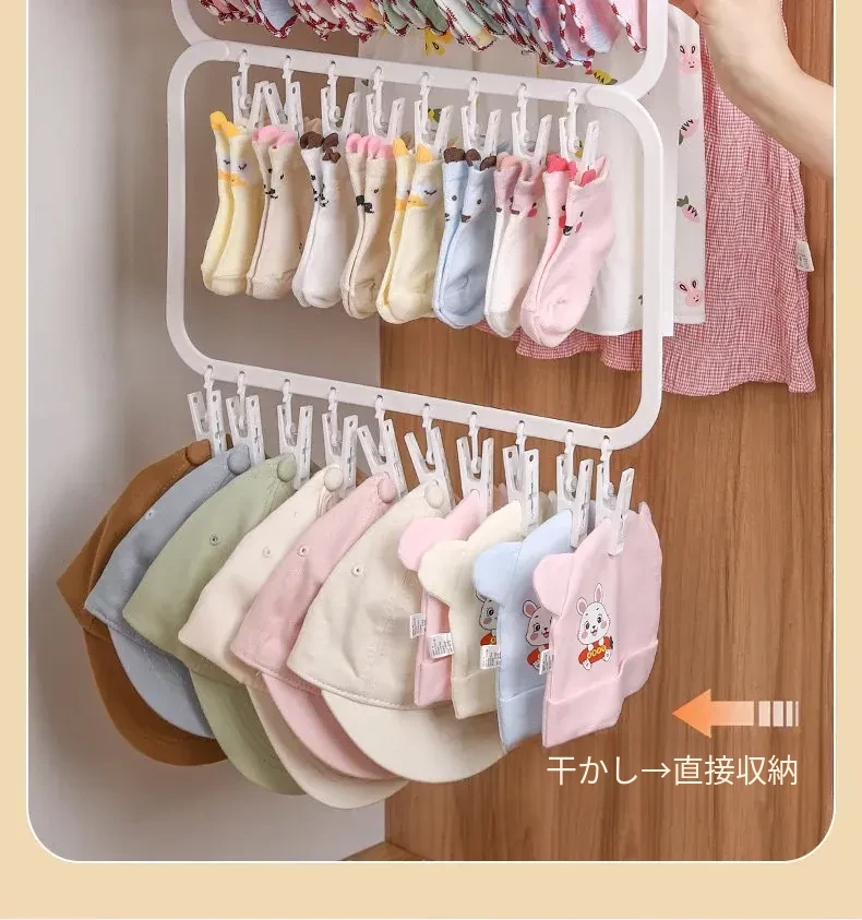 赤ちゃんの衣類収納に最適!多機能クリップ付き子供用帽子・よだれかけ乾燥スタンド【省スペース・整理整頓】衣類ハンガーフックでお部屋をスッキリ!