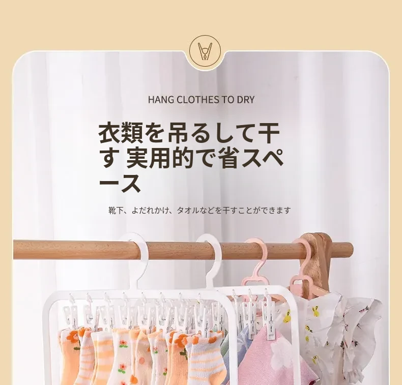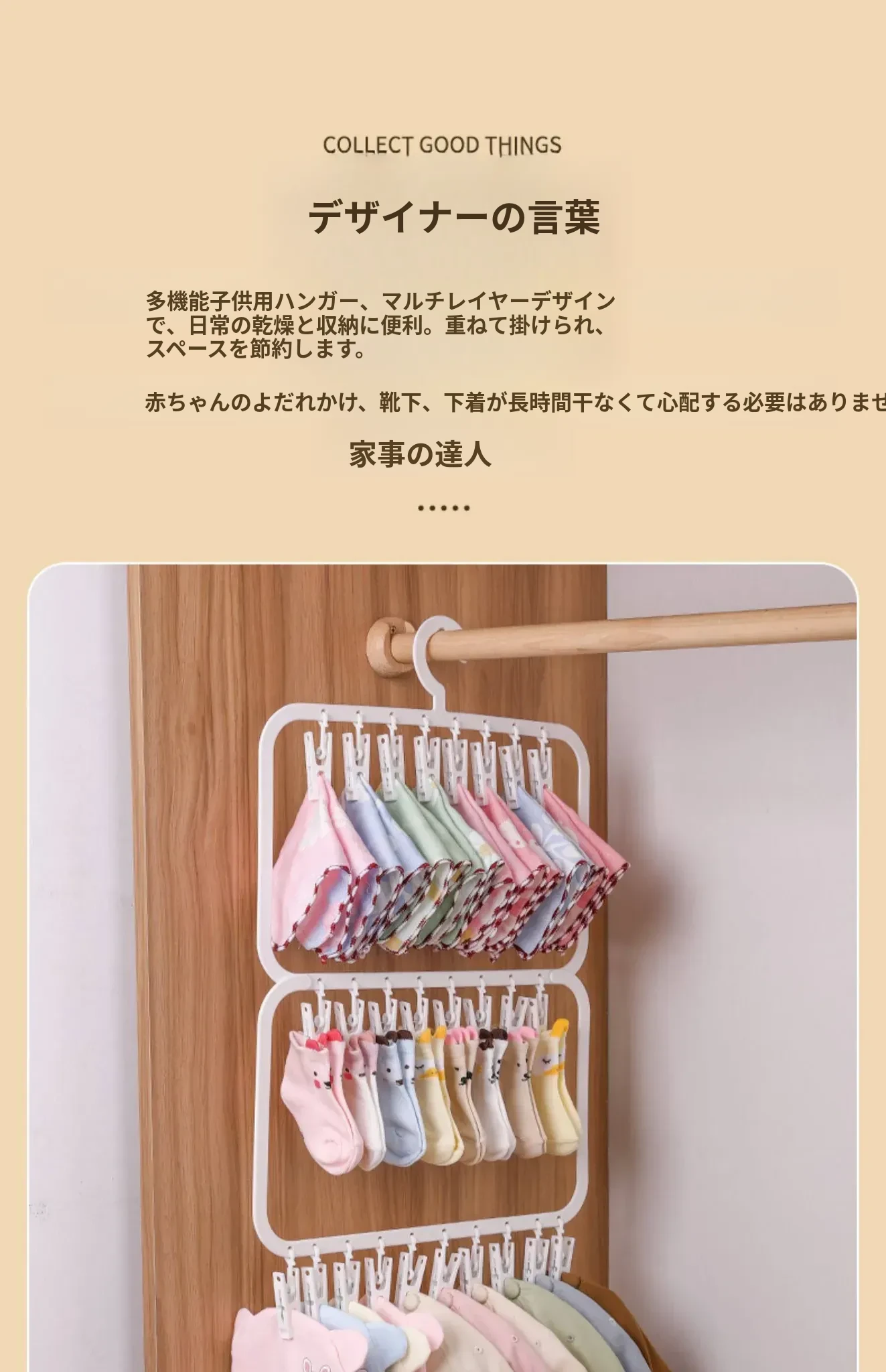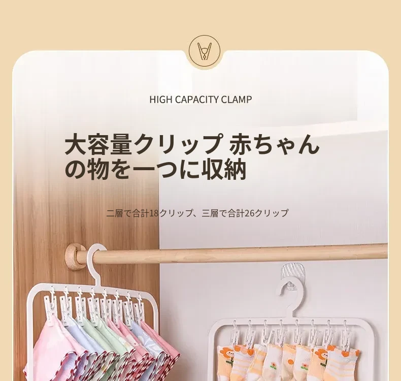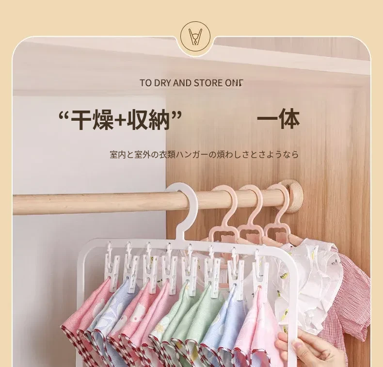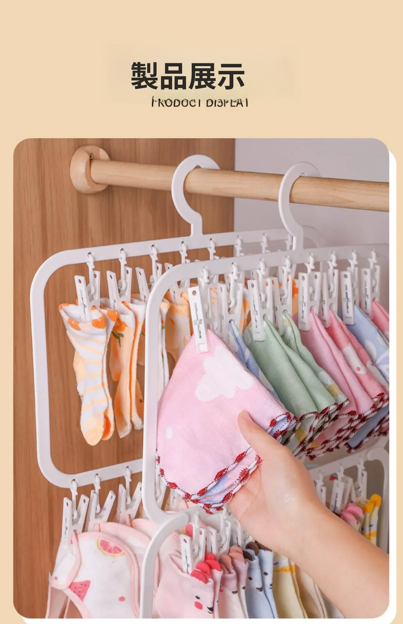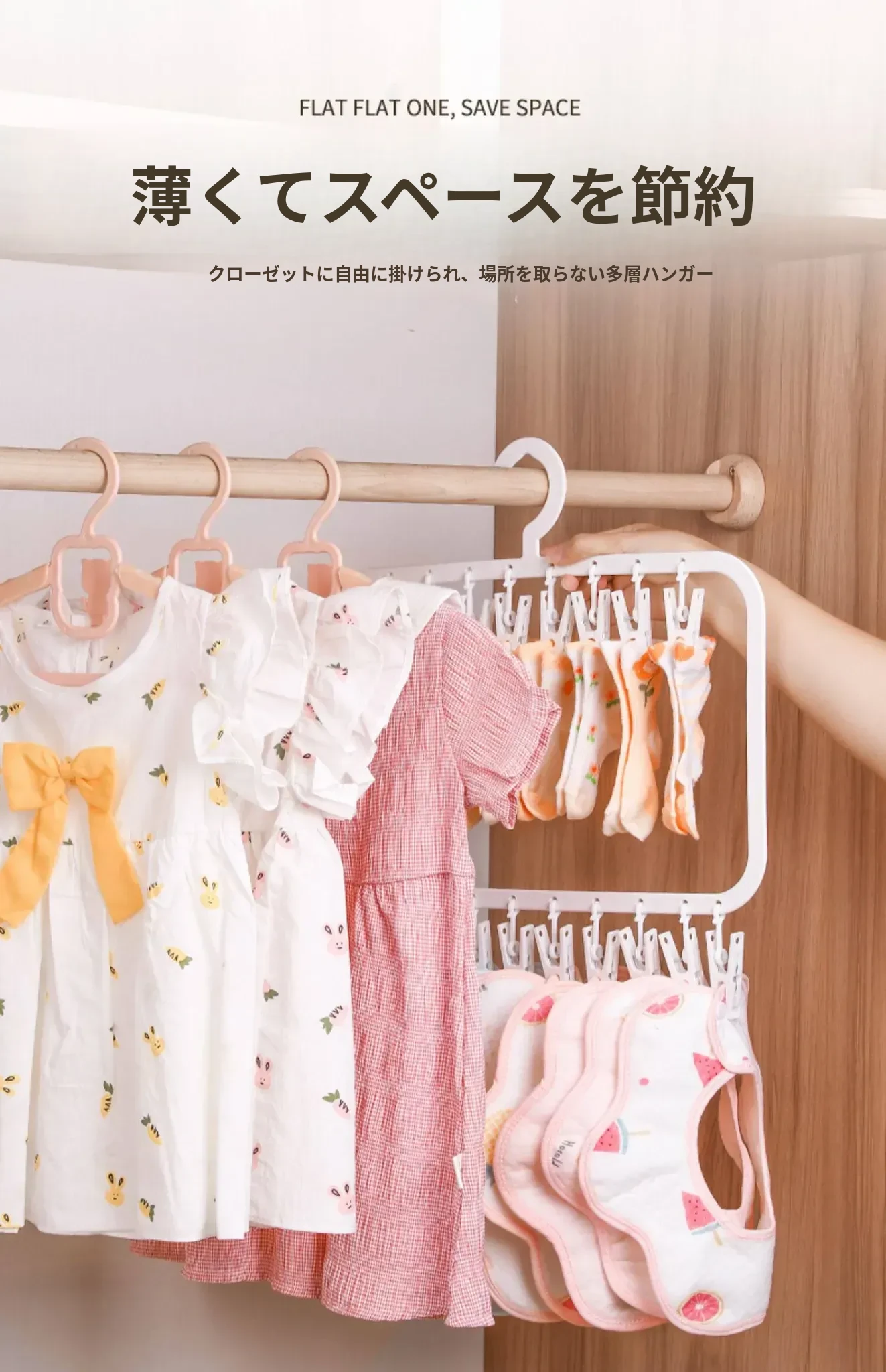 赤ちゃんの衣類収納に最適!多機能クリップ付き子供用帽子・よだれかけ乾燥スタンド【省スペース・整理整頓】衣類ハンガーフックでお部屋をスッキリ!