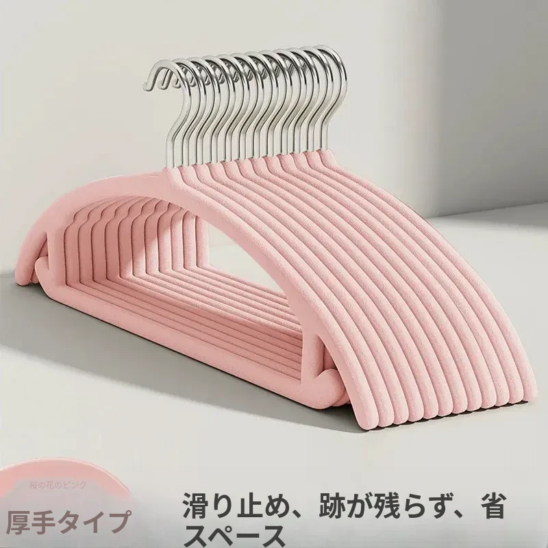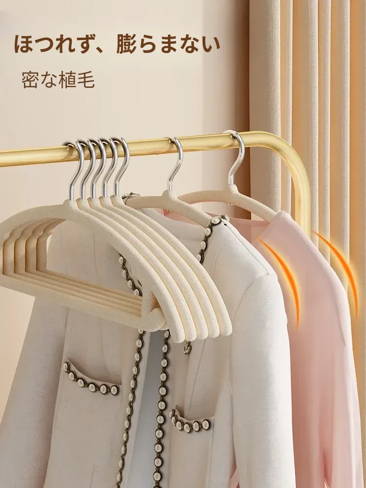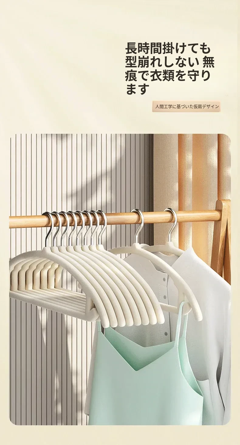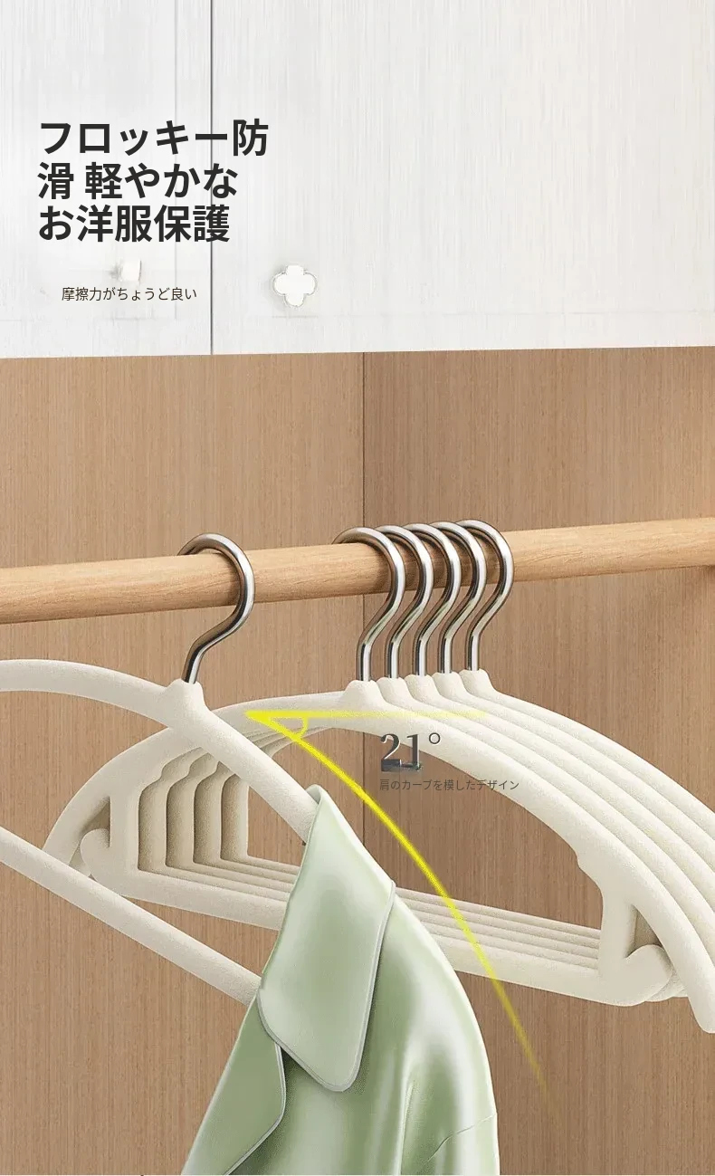 滑らかな仕上げのフロッキー衣類ハンガー - 家庭用衣類整理の必需品!肩部分が無痕で滑り止め機能付き、衣類をしっかり支え、型崩れを防ぎます。美しい収納を実現!